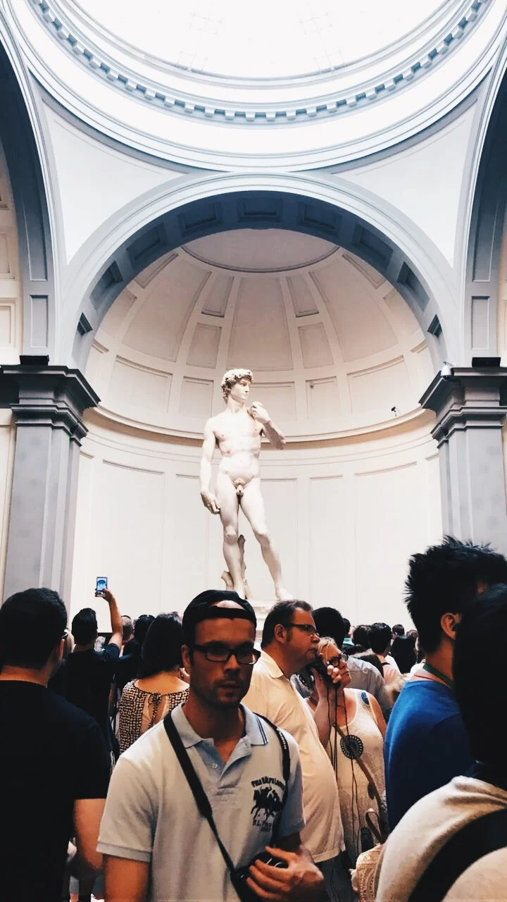 Whatever you do, don't visit Italy during the summer. I promise you WILL be absolutely miserable. Today it was raining in Milan, so I decided to take a day trip to Florence, where I intended to spend my time in Galleria Dell'Accademia, under the constant flow of crisp AC. I spent all of yesterday exploring Milan, admiring the Duomo, and getting drunk off Bloody Marys by myself, and sweating my ass off! I thought it was time for something new. As I rounded the street corner to the museum in Florence, and saw the length of the admission line (it literally wrapped all the way around the building), I decided to do what any true tourist would, and paid 5 times the normal price of a ticket to skip the line and escape the heat. It even came with the perk of a guided tour. So, I'm waiting in line with my fellow tourists, and our guide drops a huge bomb on us, letting us know that the AC broke ten days ago...just my luck! But I had to push on and bare the heat to gain my money's worth. I followed the guide through the tiny, hot museum, and waited for the moment when we would come face to face with Michelangelo's David. We exited one room of paintings and entered another. There he was at the end of the room, regal, positioned in the center of a circle of archways. He was...gifted to say the least. I had seen pictures of him prior to my encounter, but they were incomparable to the real thing. He was beautiful, a true masterpiece. He was worth every euro.