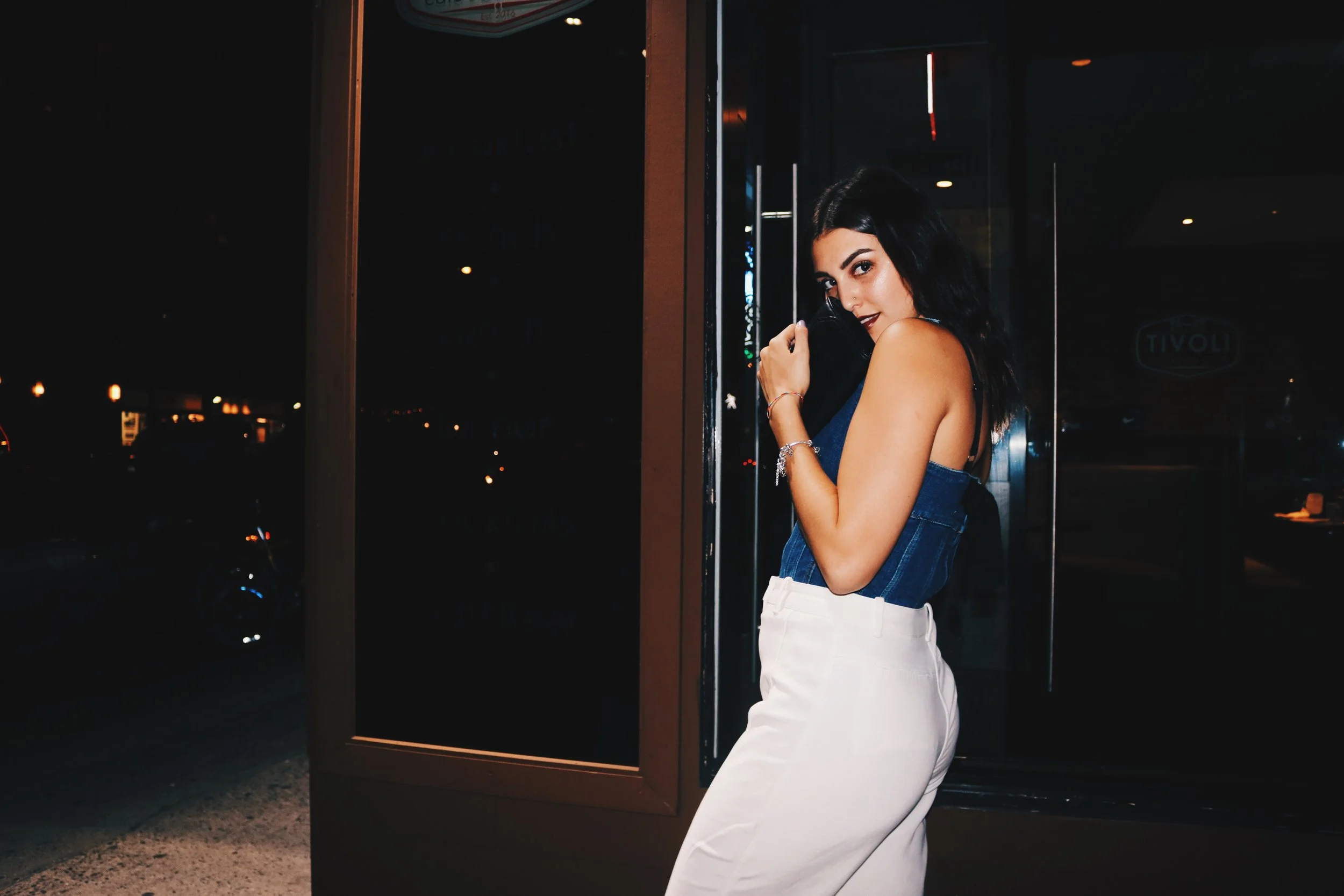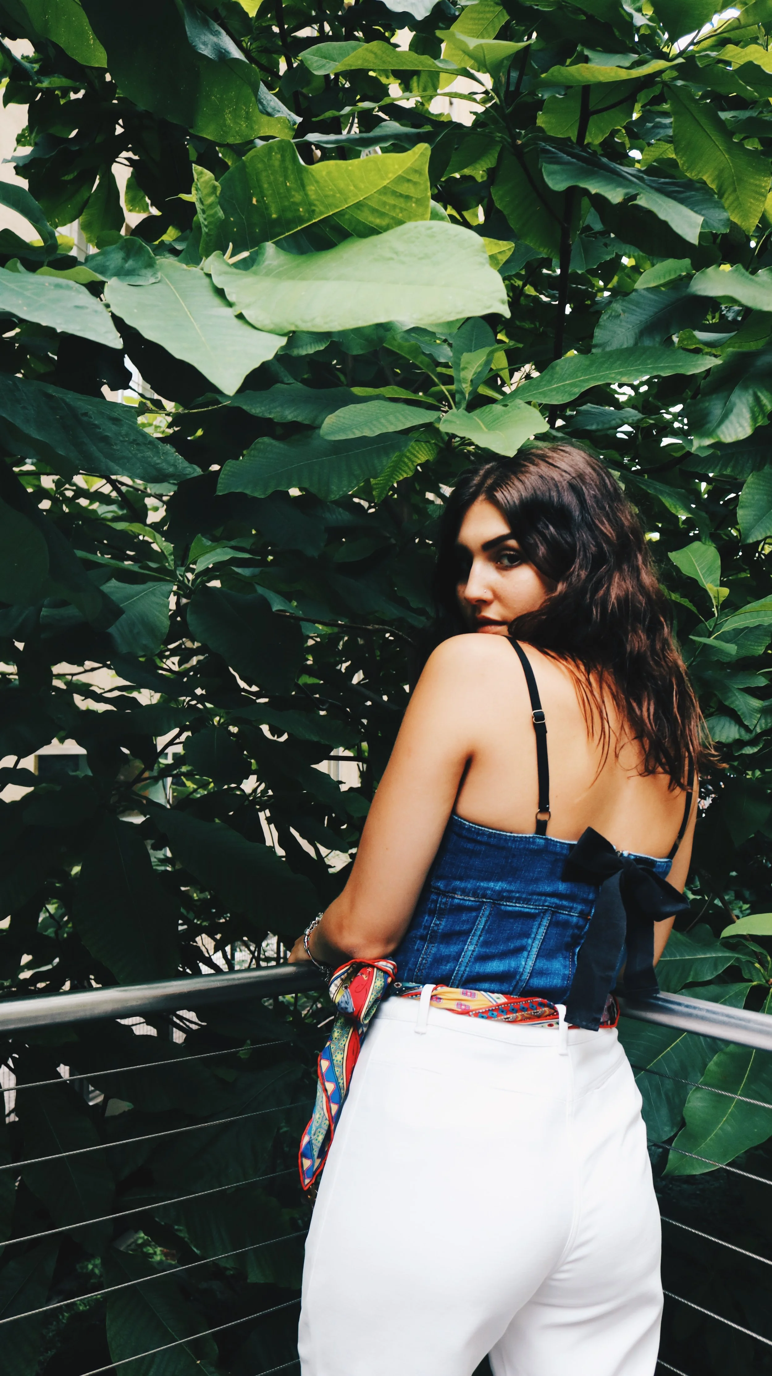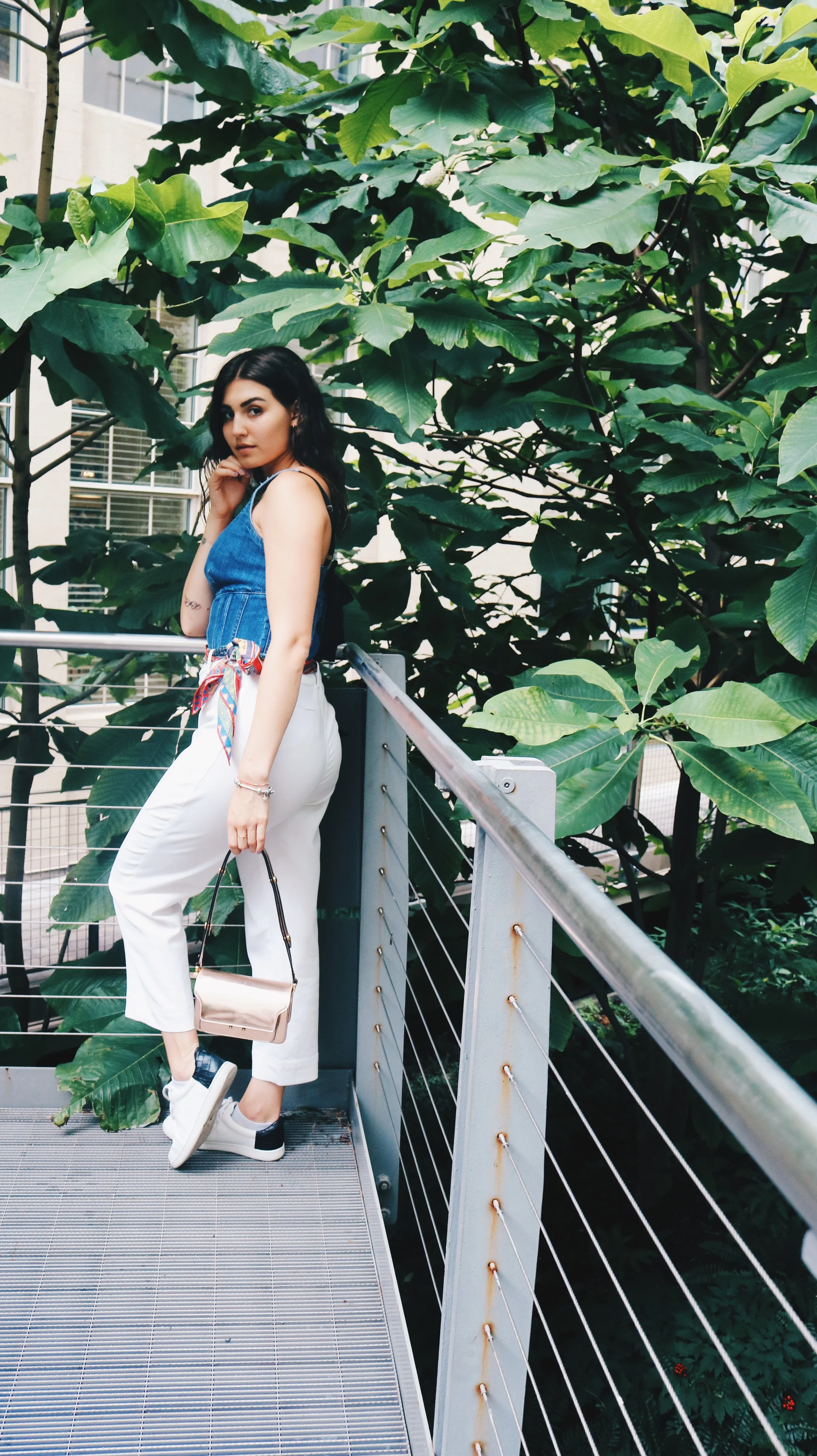 This weekend, my best friend, Anabell, came to visit me in Manhattan. We took advantage of our limited girl time, spending our days exploring the city, and our nights bar hopping. In efforts to conserve laundry and dry cleaning funds, I decided to transform my daytime outfits into nighttime looks. Yesterday, we spent the day brunching in Chelsea and walking the Highline. I wore a great pair of easy, summery, white pants with a denim bustier and sneaks (comfy for a warm, active day). And, when nighttime rolled around, I made a few simple swaps to jazz up my look a little.